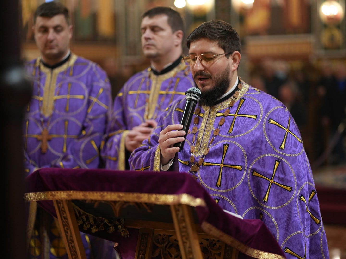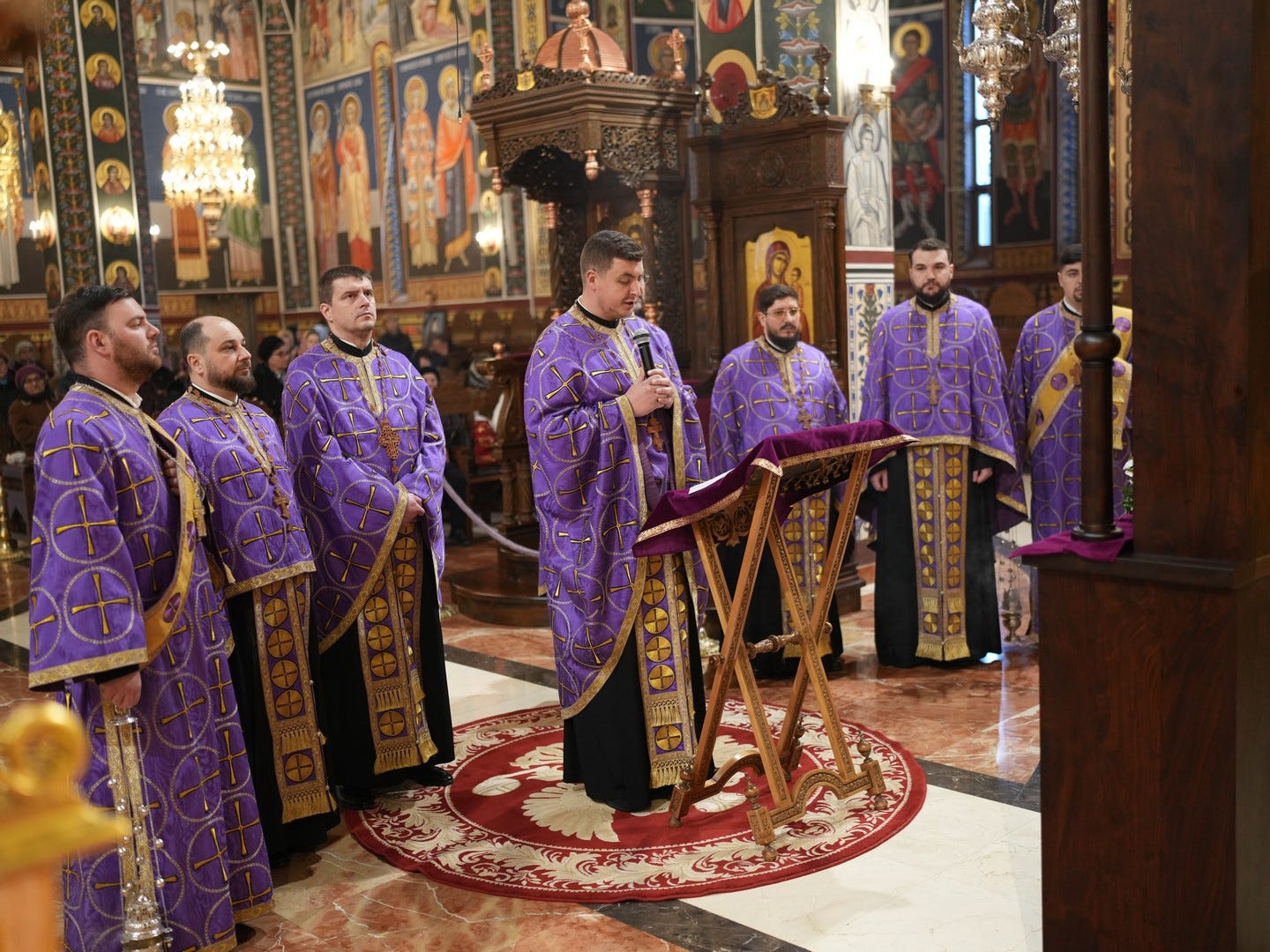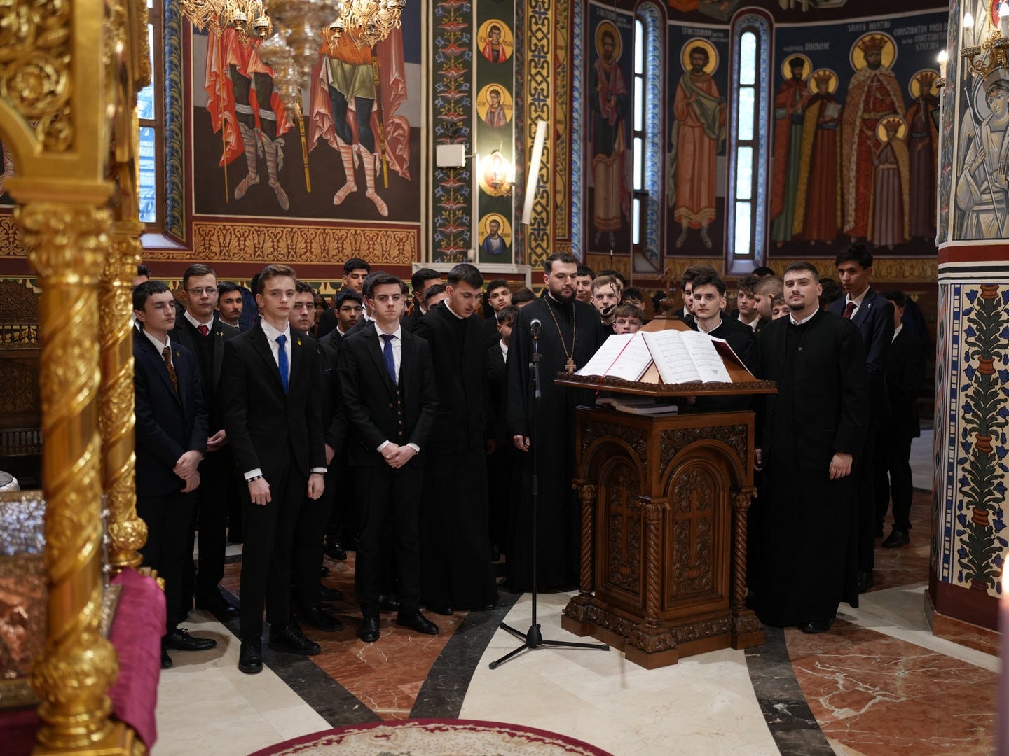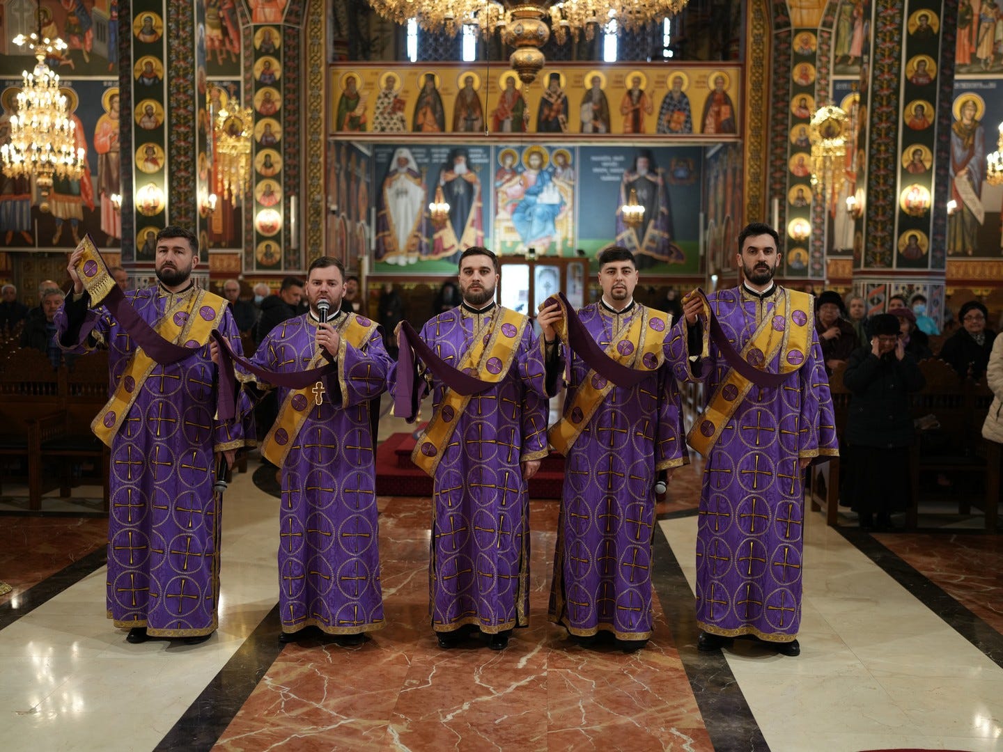 Preacucernicul părinte arhidiacon și profesor Iulian Turtoi a dirijat corul Seminarului Teologic „Sfântul Ioan Gură de Aur” din Slobozia, care a întreținut dialogul liturgic al slujbei.