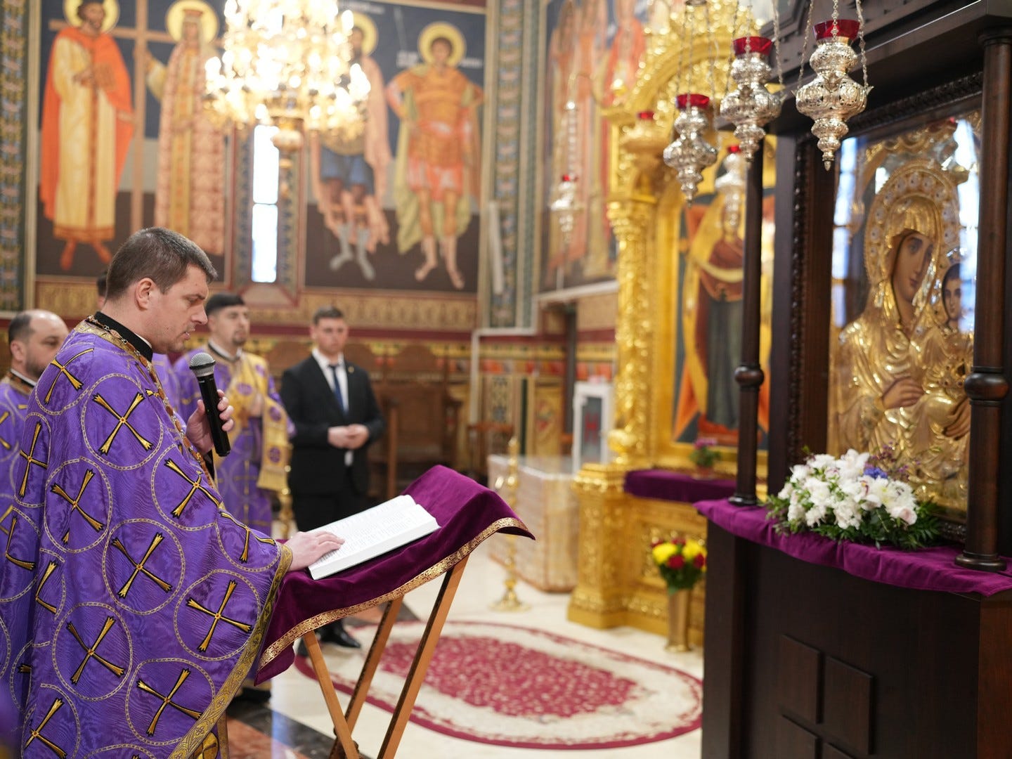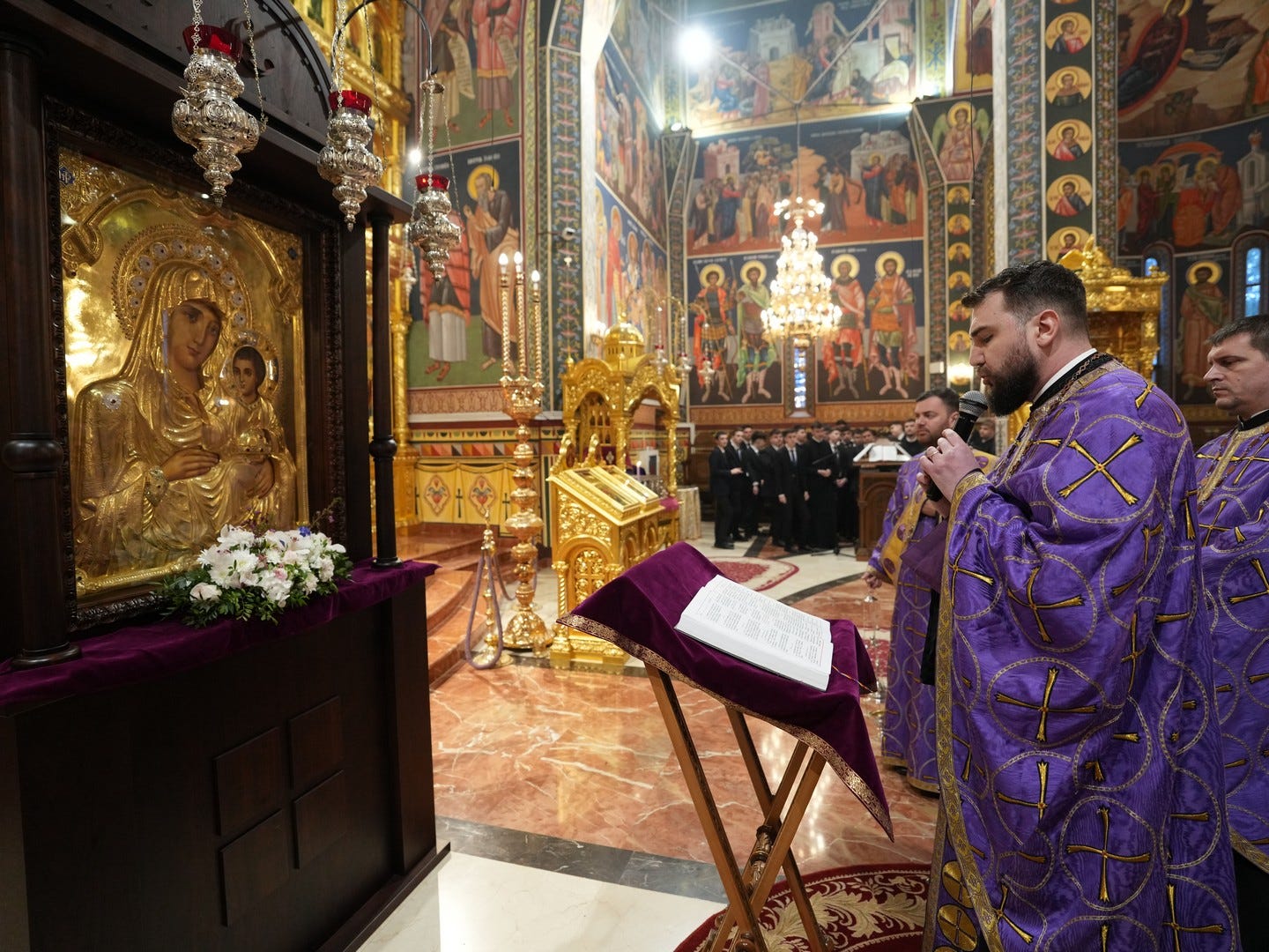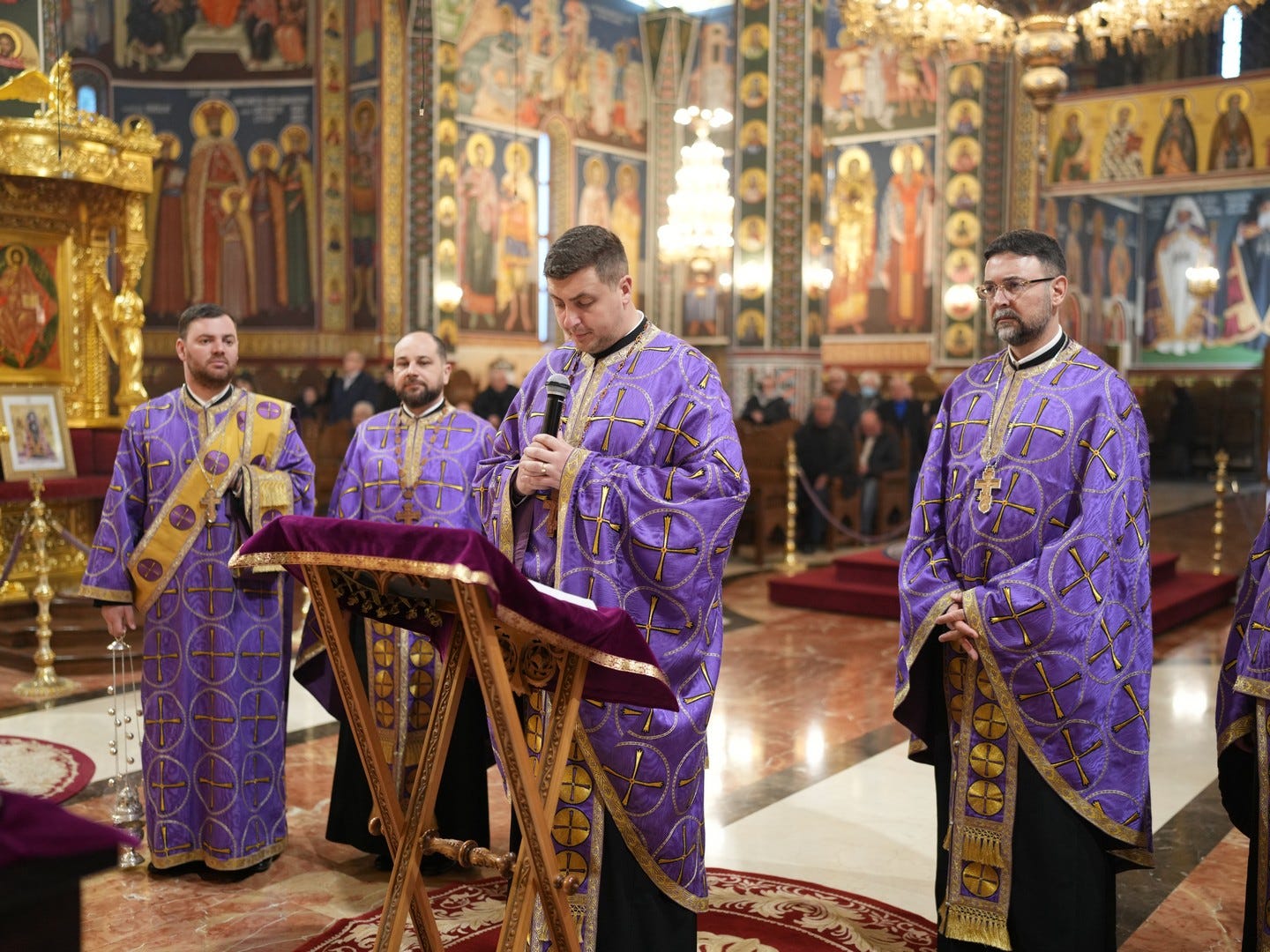 Preacucernicul părinte arhidiacon și profesor Iulian Turtoi a dirijat corul Seminarului Teologic „Sfântul Ioan Gură de Aur” din Slobozia, care a întreținut dialogul liturgic al slujbei.