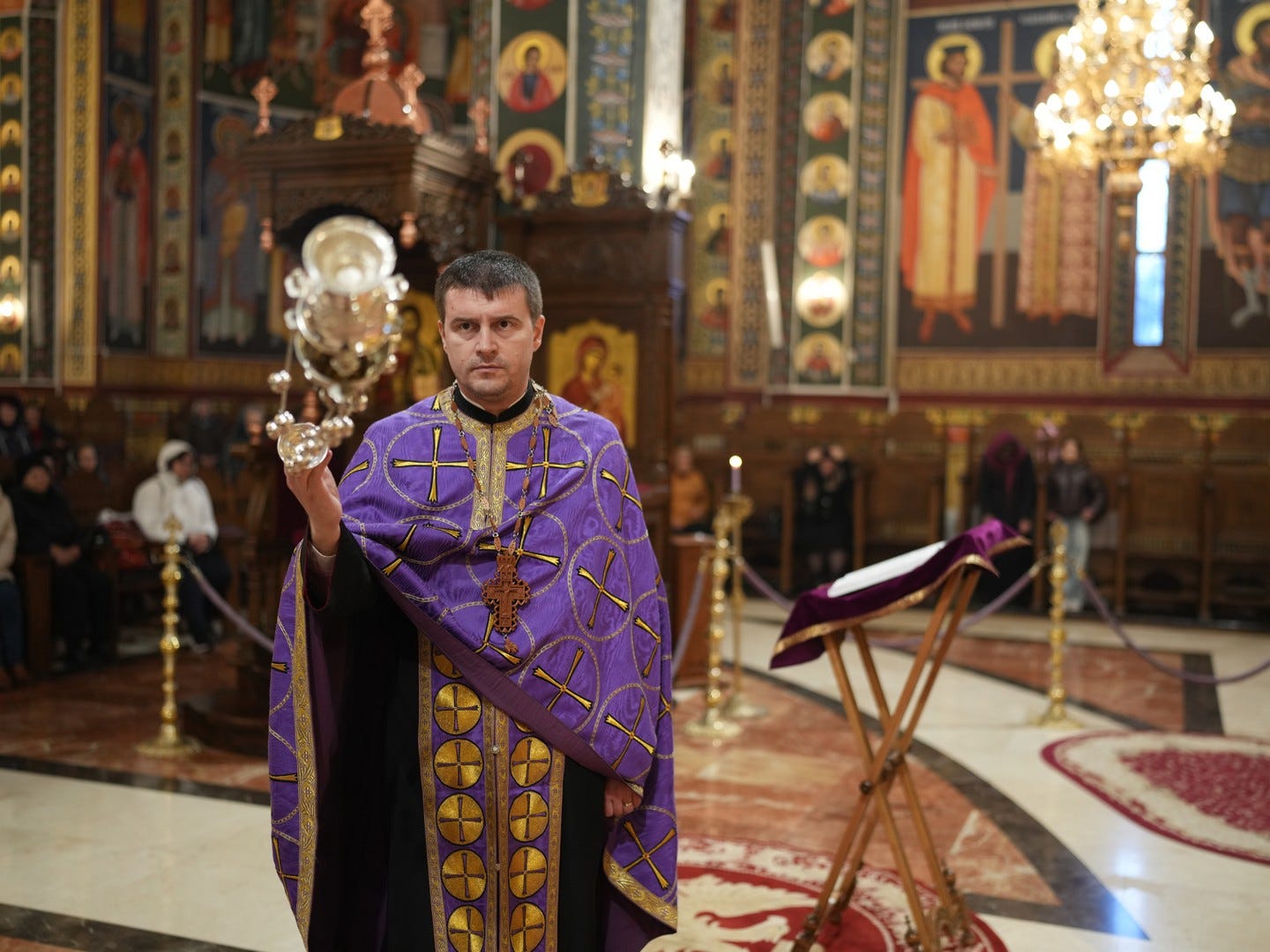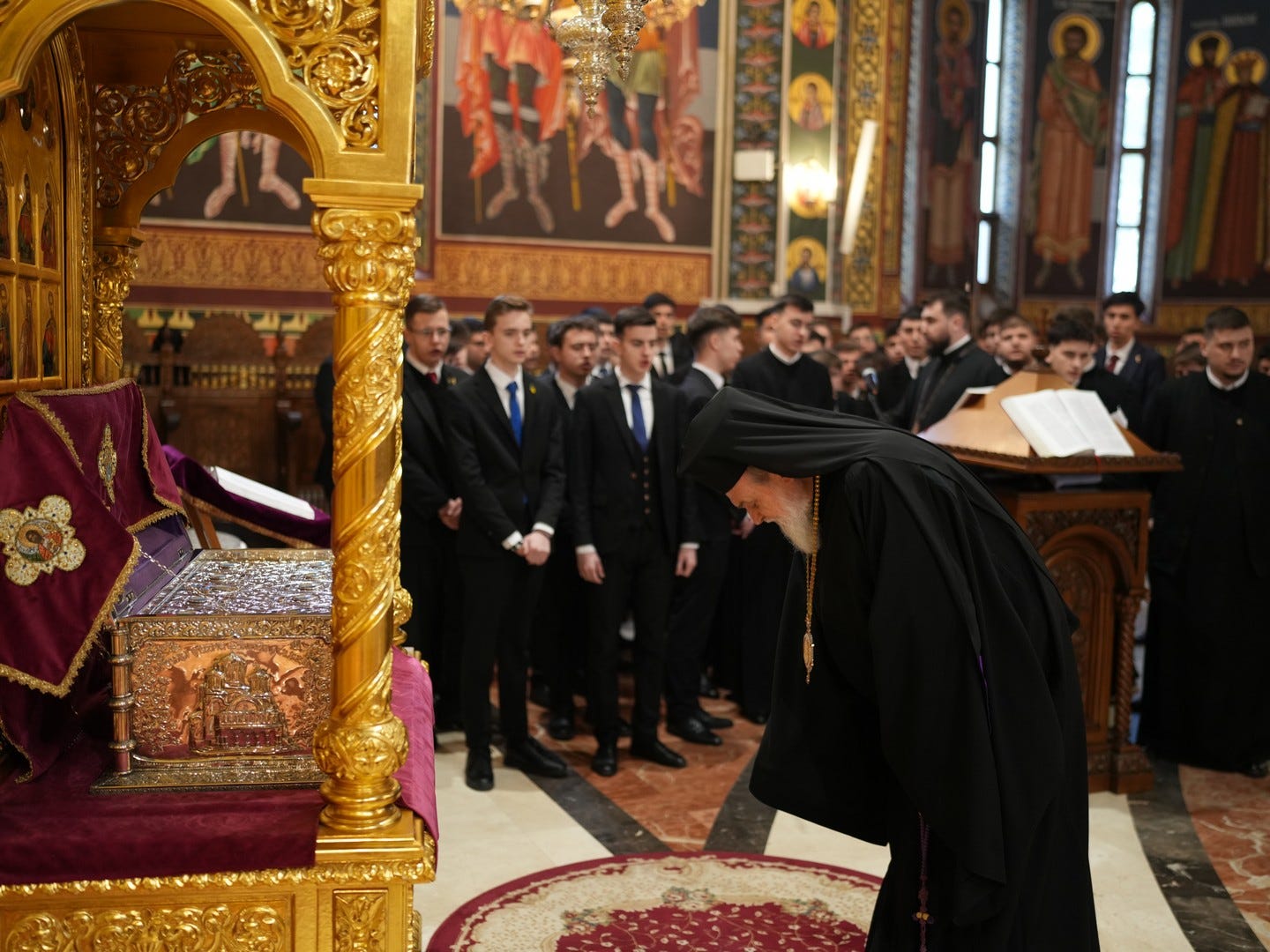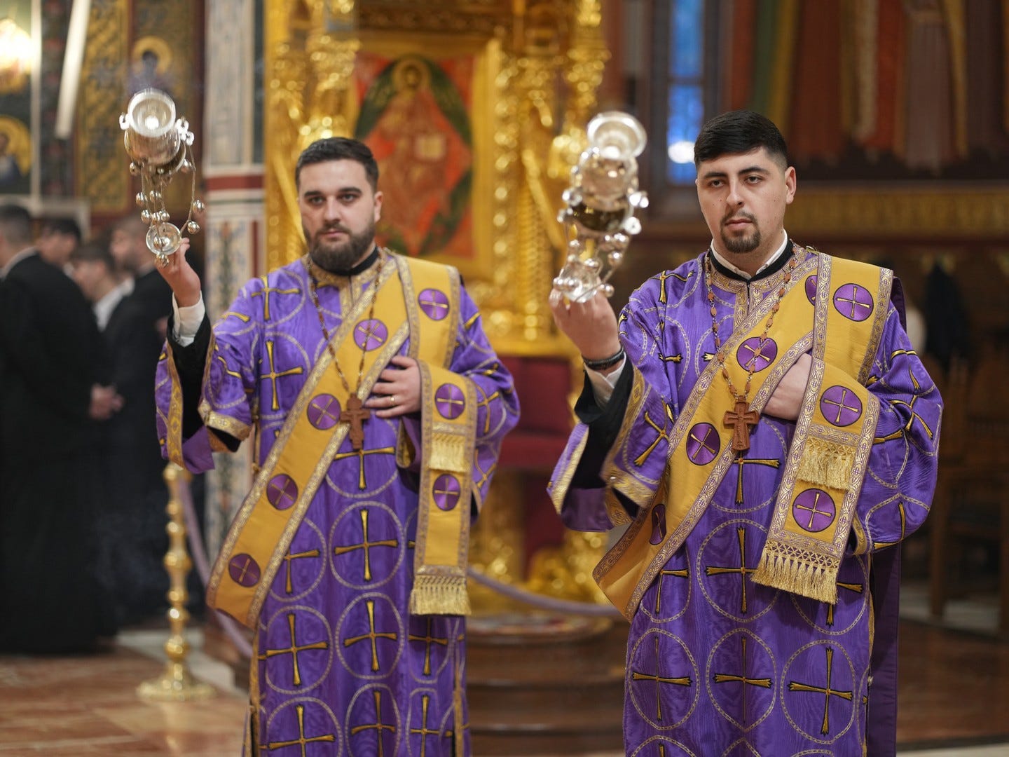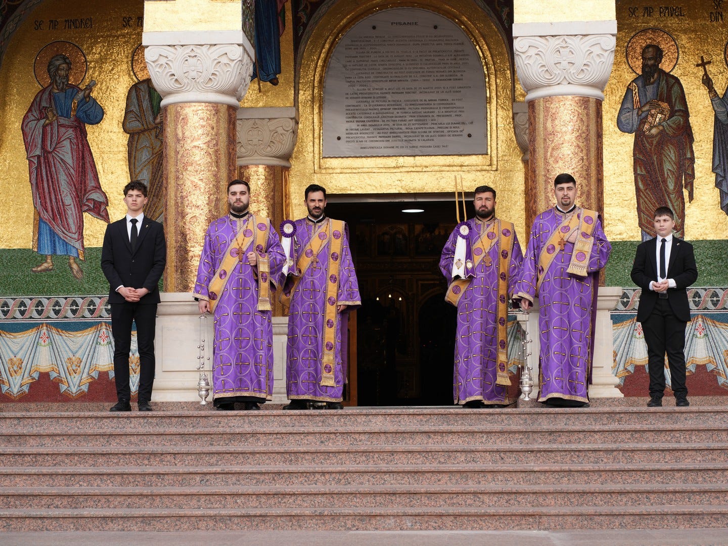 Preacucernicul părinte arhidiacon și profesor Iulian Turtoi a dirijat corul Seminarului Teologic „Sfântul Ioan Gură de Aur” din Slobozia, care a întreținut dialogul liturgic al slujbei.