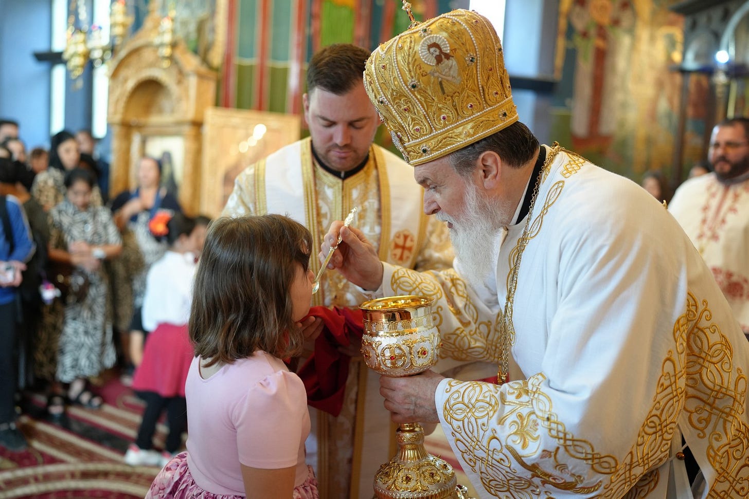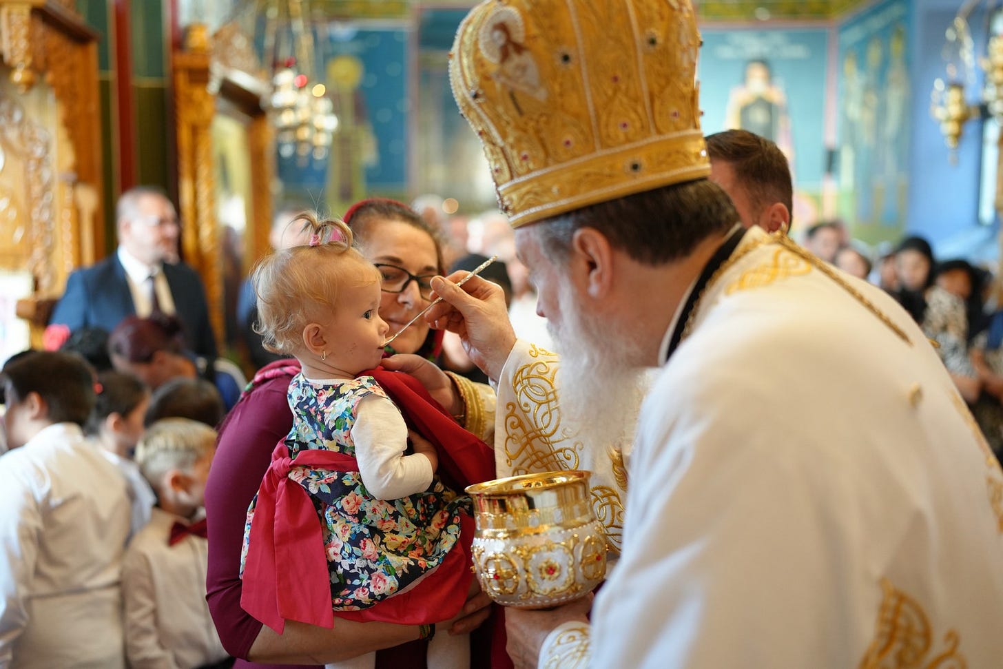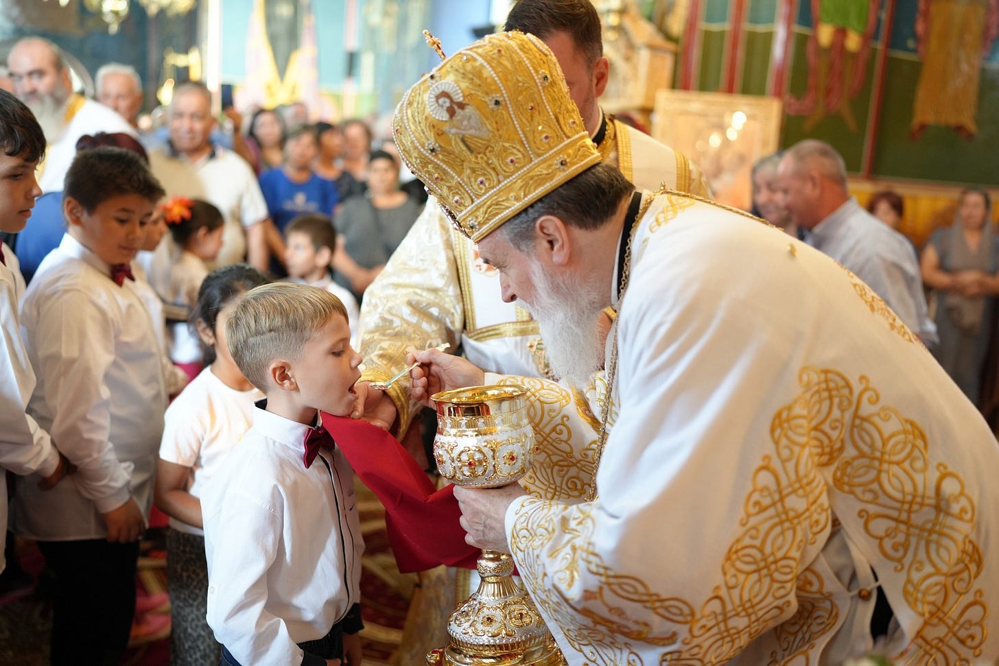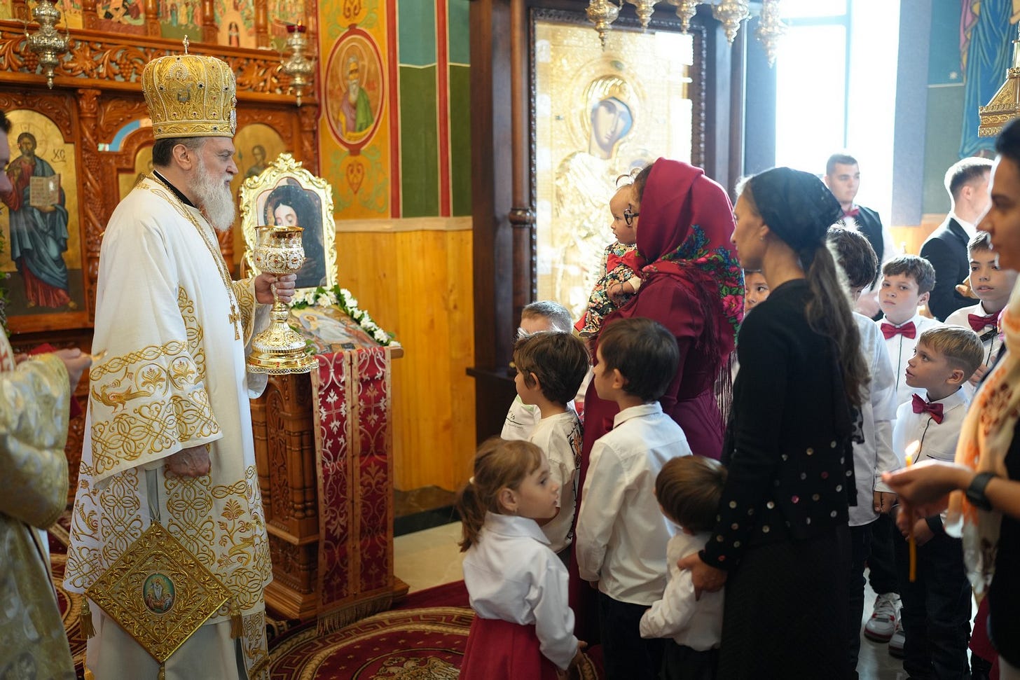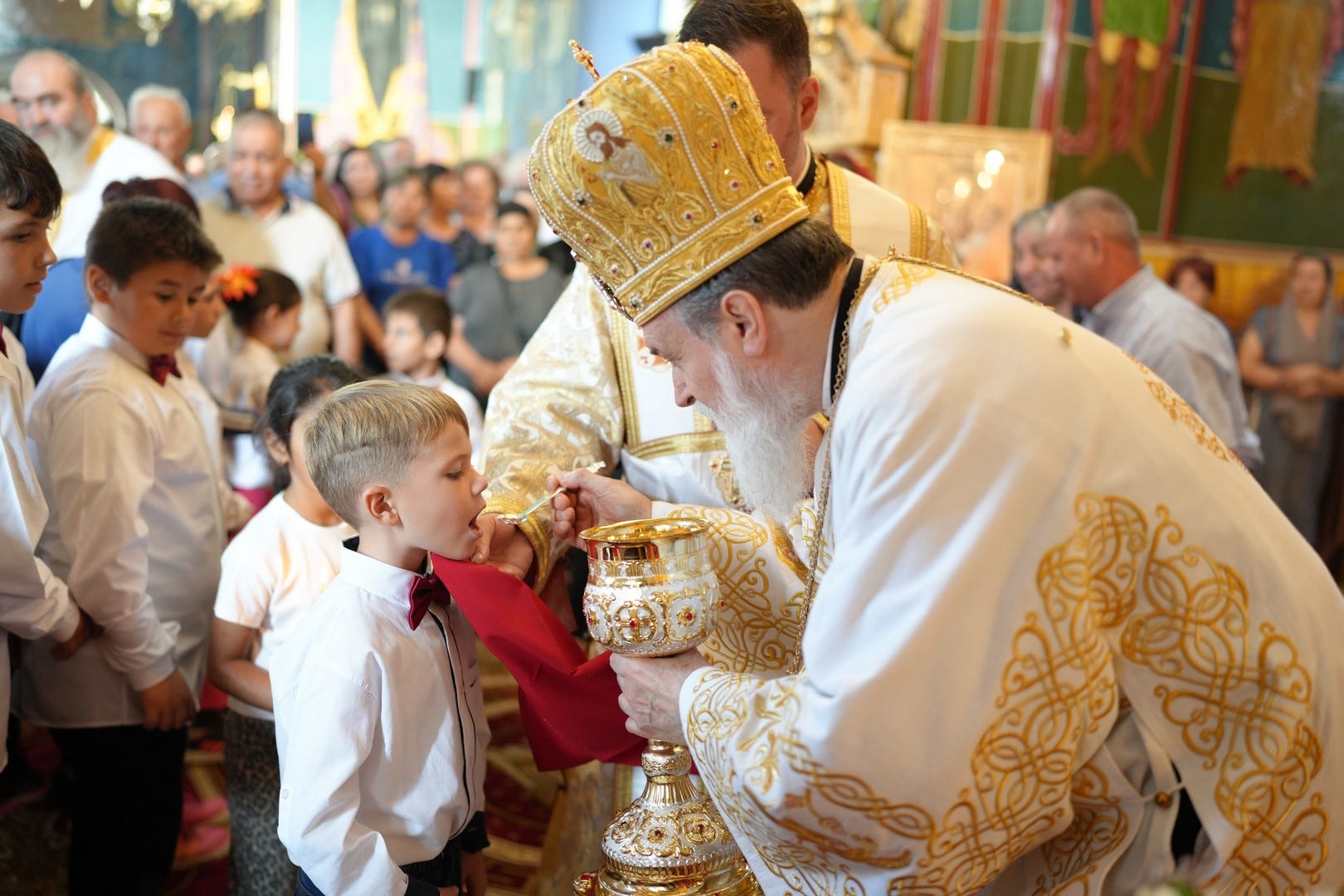 Preasfinția Sa a împărtășit copiii prezenți la Sfânta Liturghie.