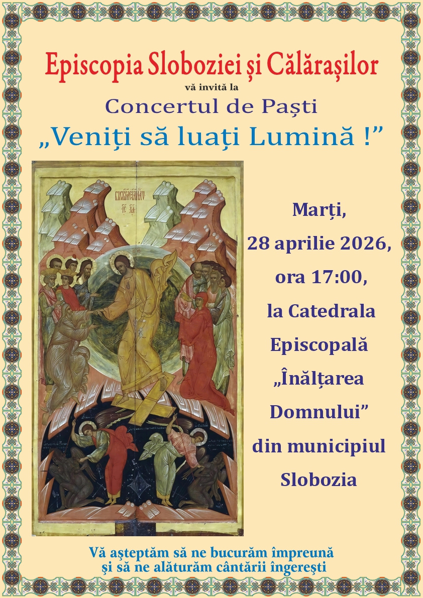 Marți, 28 aprilie 2026, începând cu ora 17:00, cu binecuvântarea și în prezența Preasfințitului Părinte Vincențiu, Episcopul Sloboziei și Călărașilor, la Catedrala „Înălțarea Domnului” din municipiul Slobozia va avea loc Concertul de Paști intitulat „Veniți să luați lumină!”.
