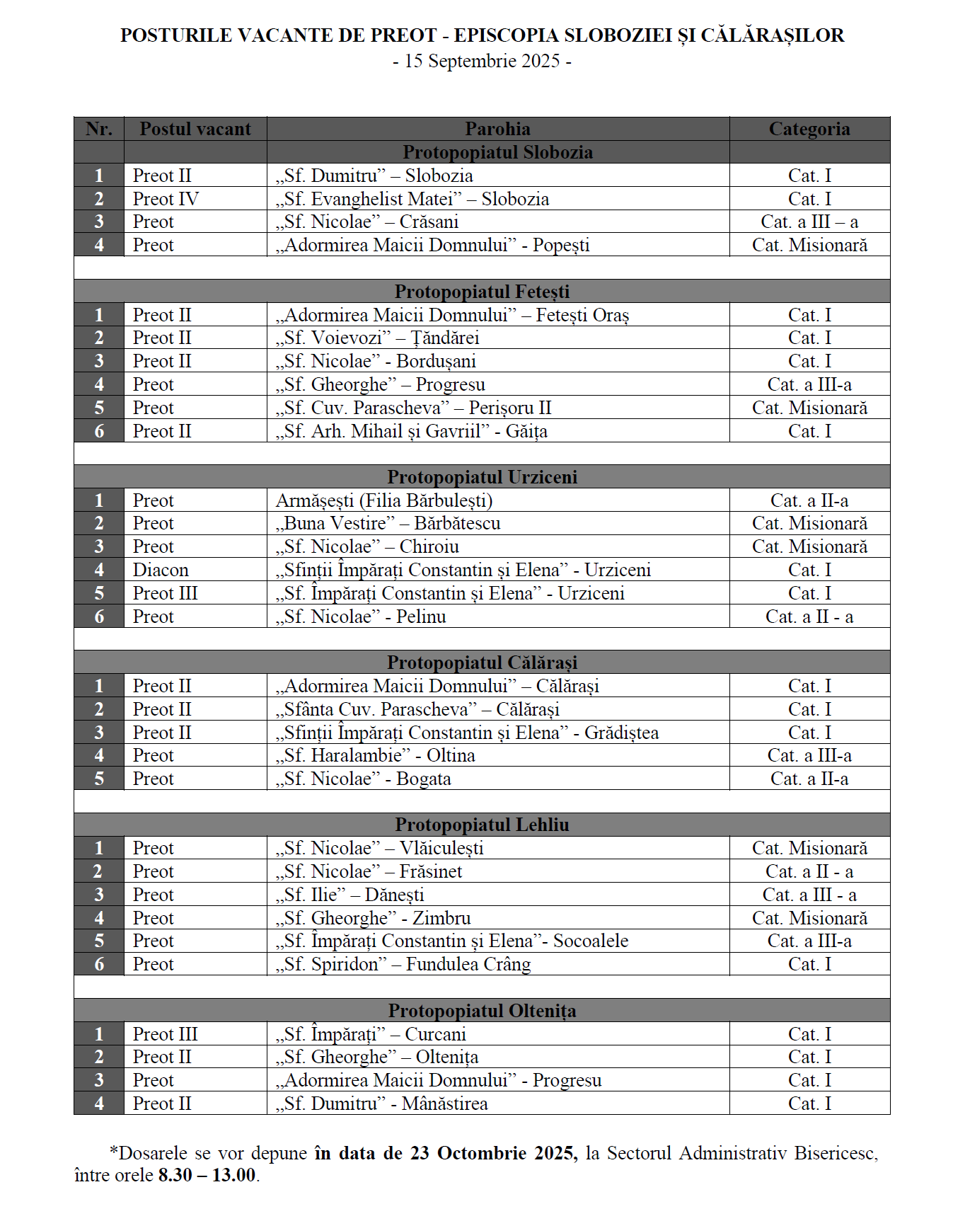 POSTURILE VACANTE DE PREOT ÎN EPISCOPIA SLOBOZIEI ȘI CĂLĂRAȘILOR – SEPTEMBRIE 2025 & Acte dosarBiroul Mass-MediaSep 18, 20251Share