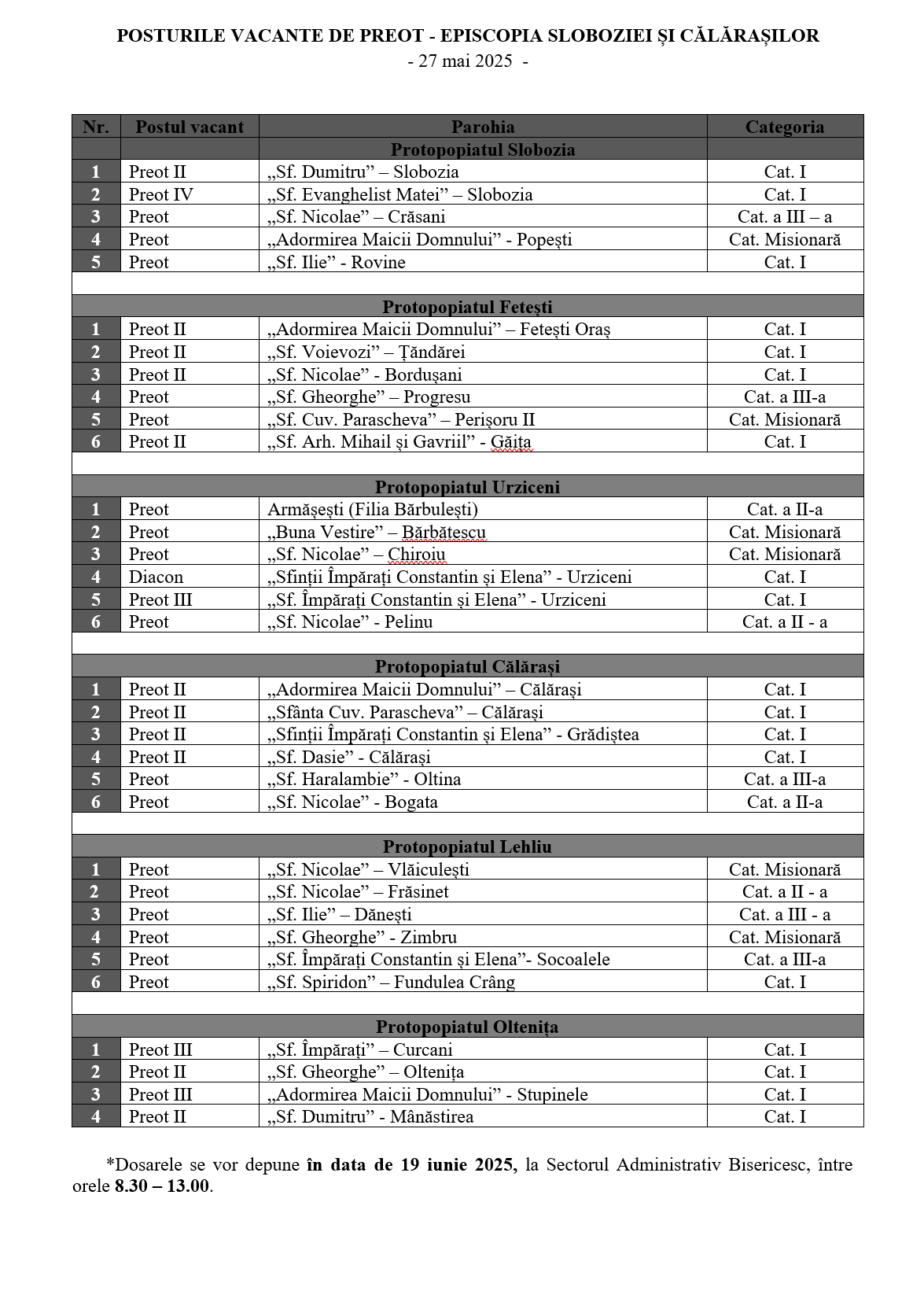 POSTURILE VACANTE DE PREOT ÎN EPISCOPIA SLOBOZIEI ȘI CĂLĂRAȘILOR – MAI 2025 & Acte dosarBiroul Mass-MediaJun 04, 20251Share