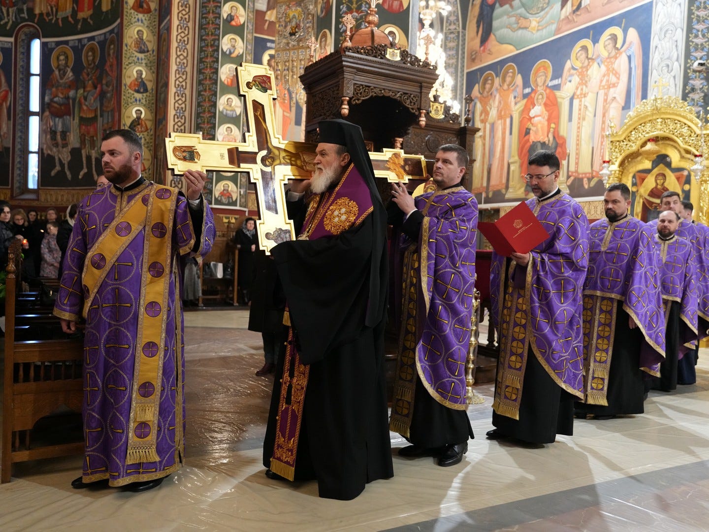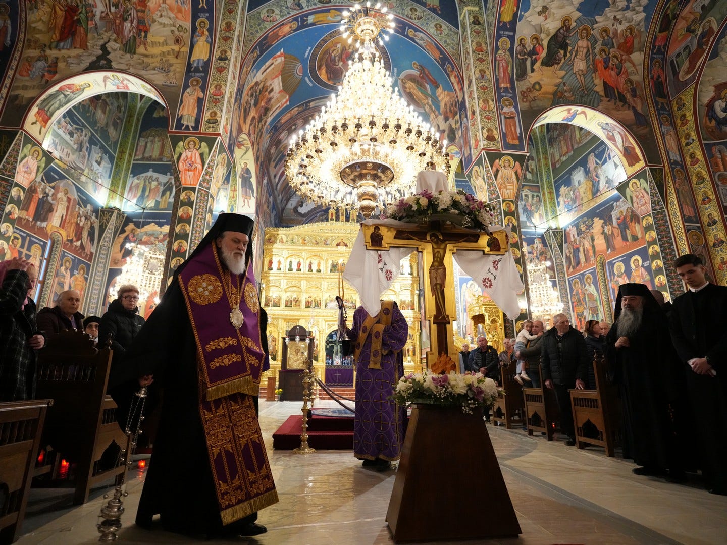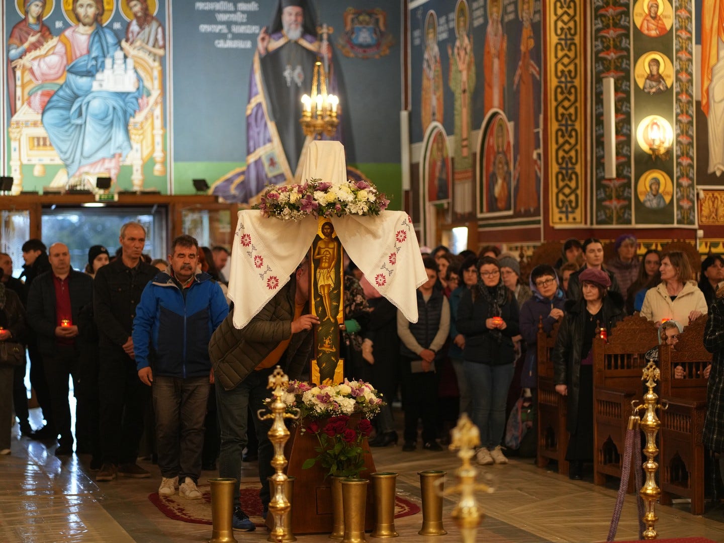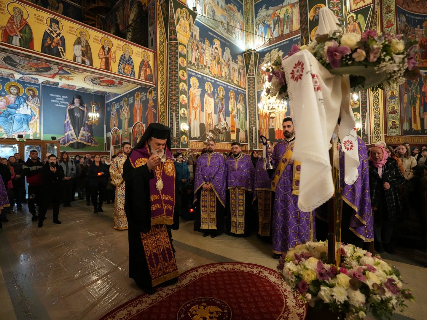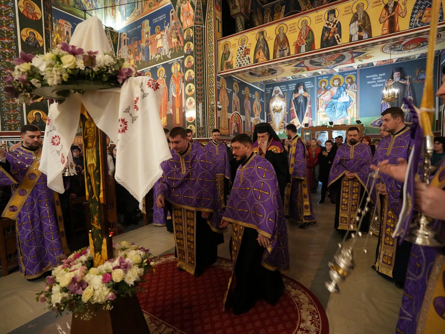 Un moment deosebit al slujbei a fost aducerea Sfintei Cruci în mijlocul bisericii, unde a fost așezată spre închinare, simbolizând jertfa lui Hristos pentru mântuirea lumii.