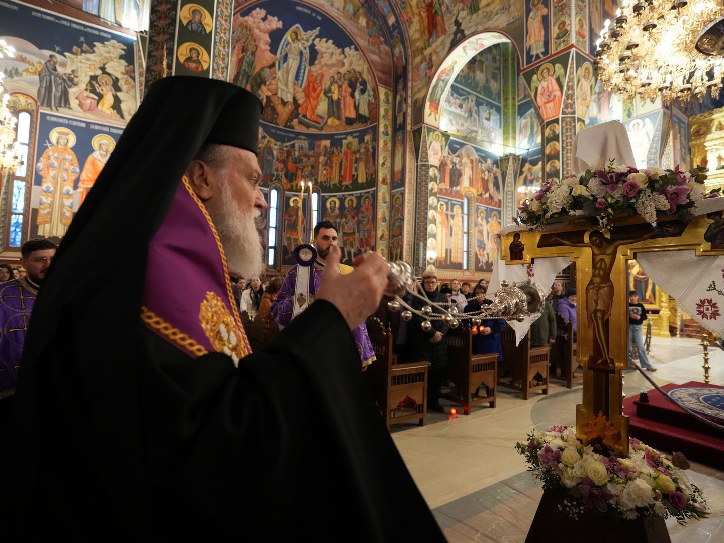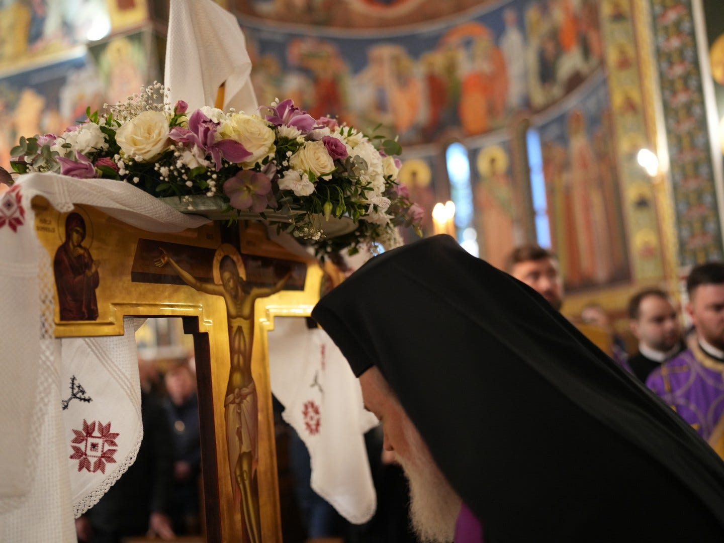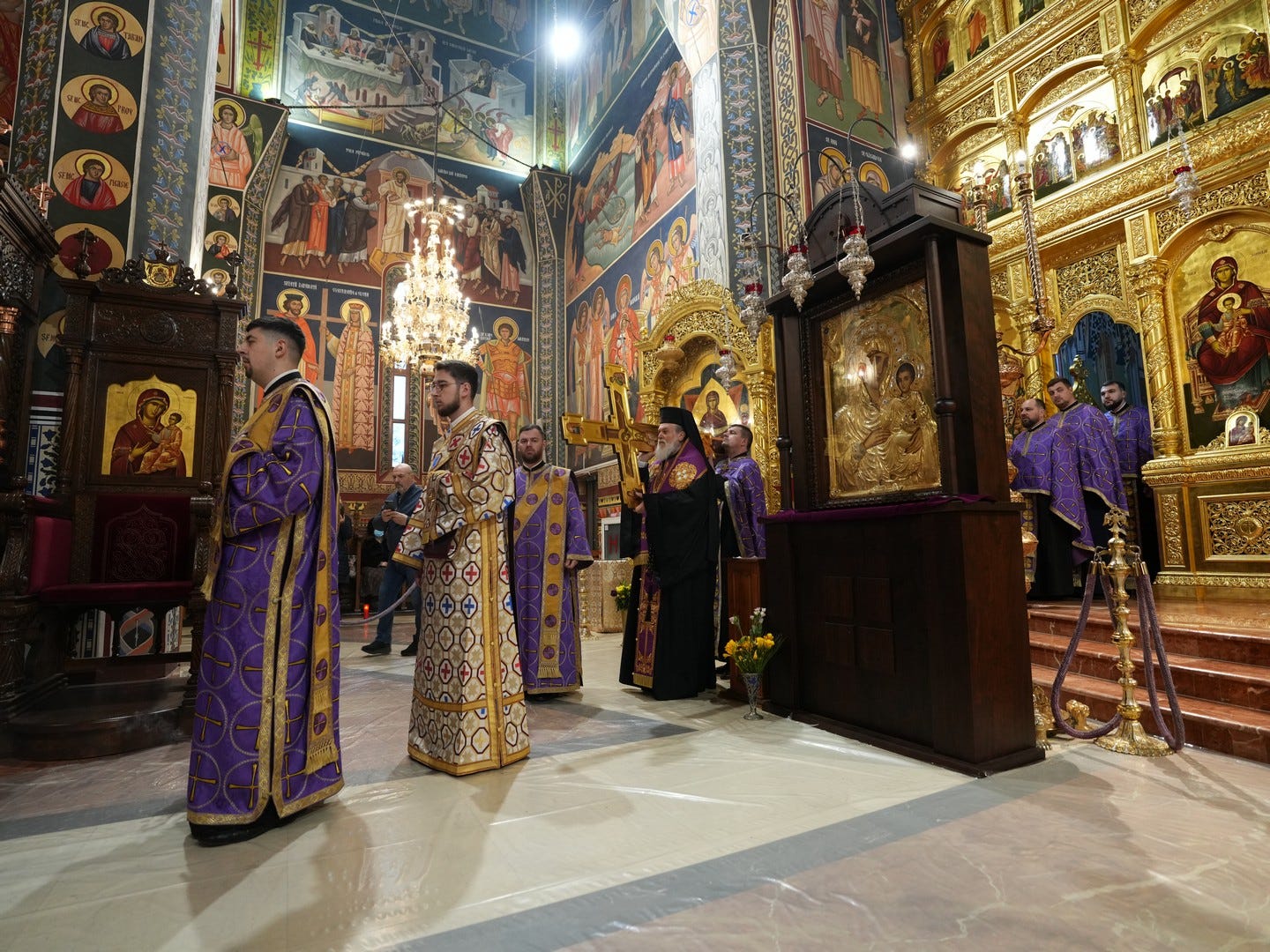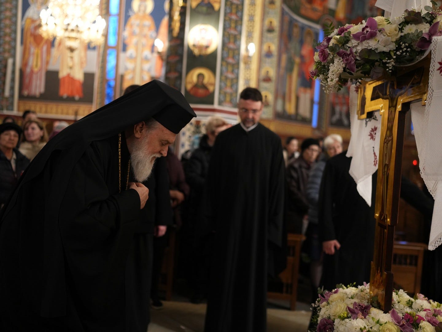 Un moment deosebit al slujbei a fost aducerea Sfintei Cruci în mijlocul bisericii, unde a fost așezată spre închinare, simbolizând jertfa lui Hristos pentru mântuirea lumii.