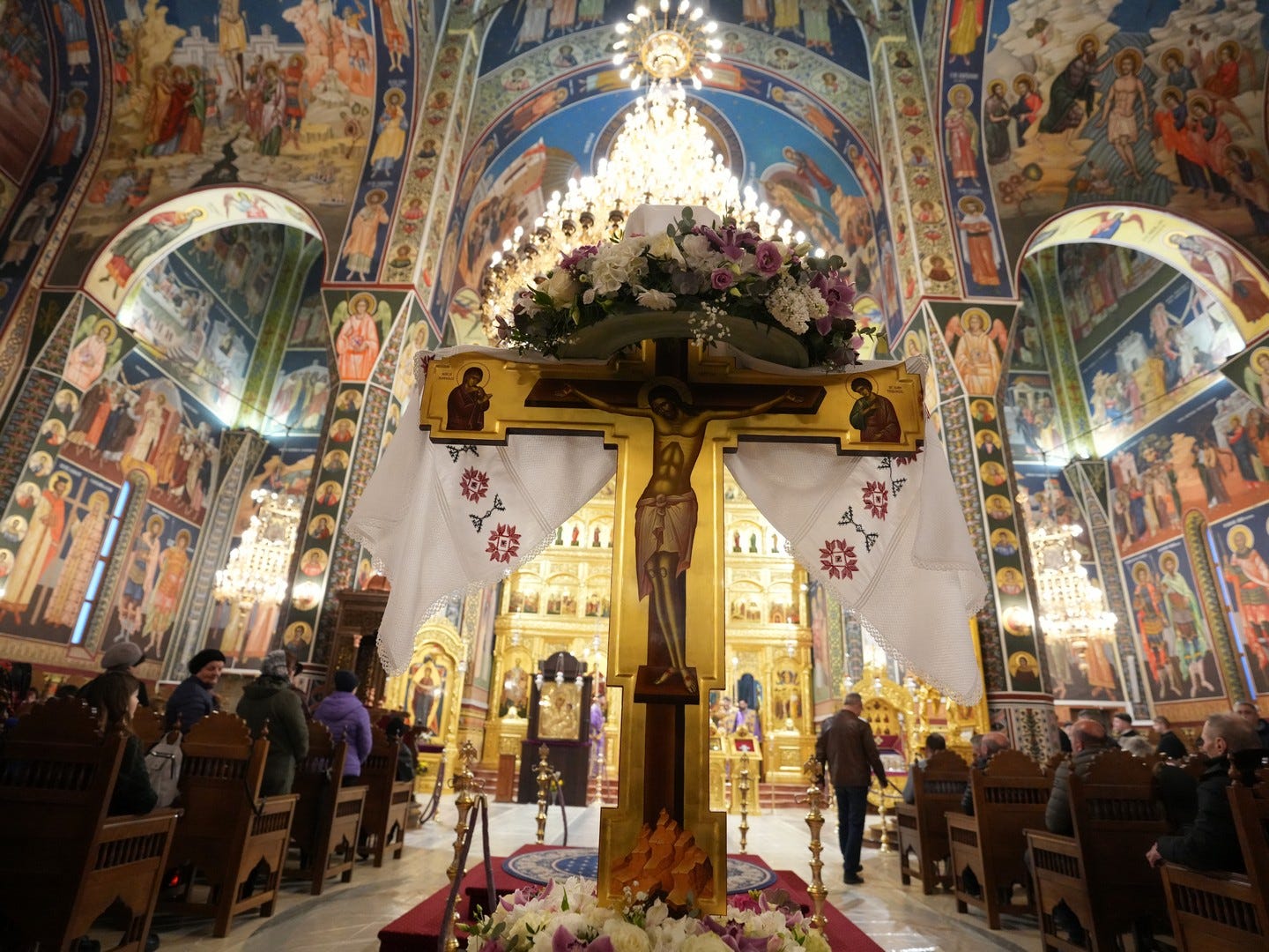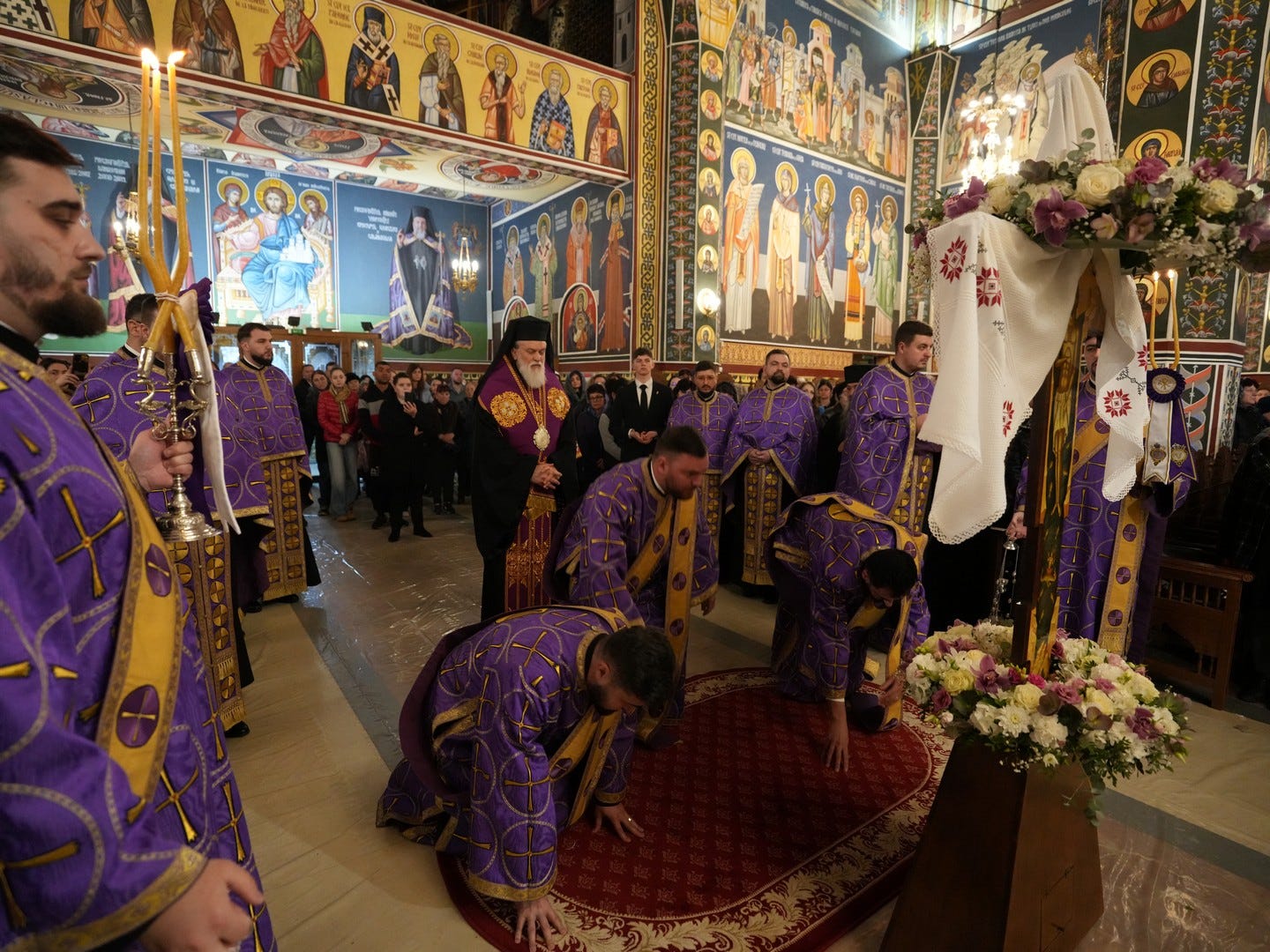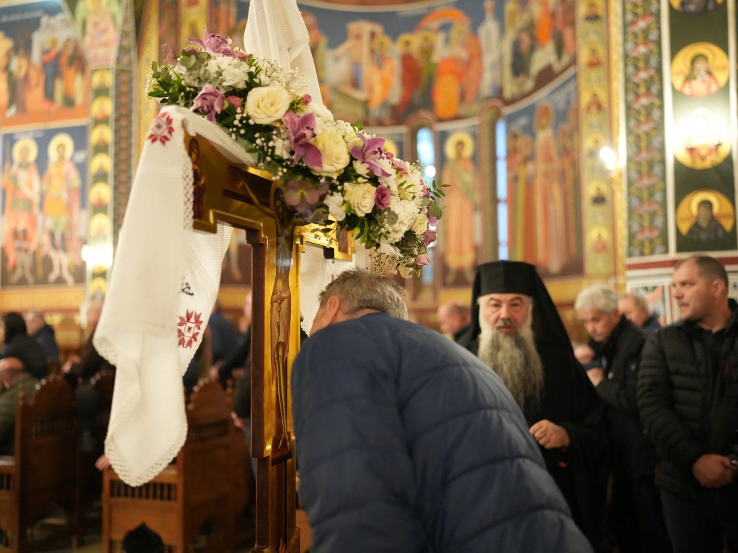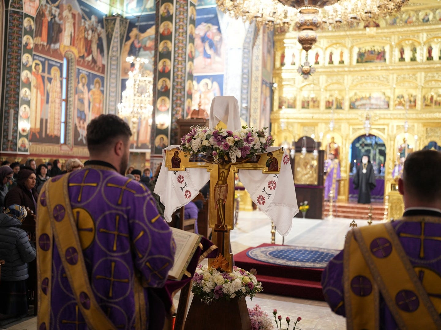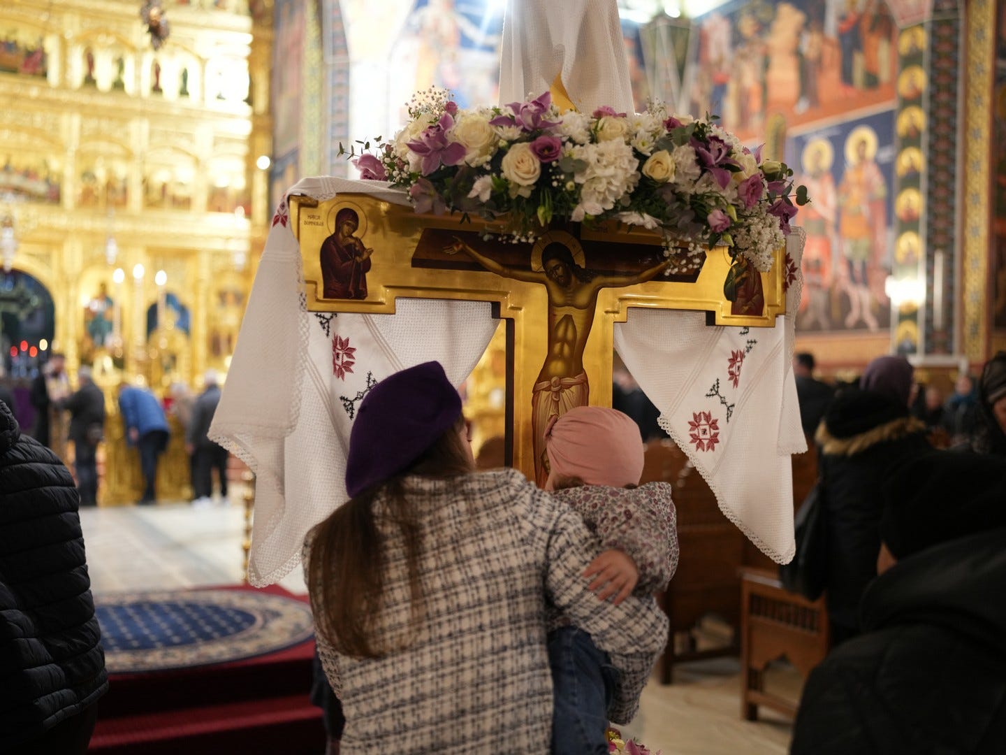 Un moment deosebit al slujbei a fost aducerea Sfintei Cruci în mijlocul bisericii, unde a fost așezată spre închinare, simbolizând jertfa lui Hristos pentru mântuirea lumii.